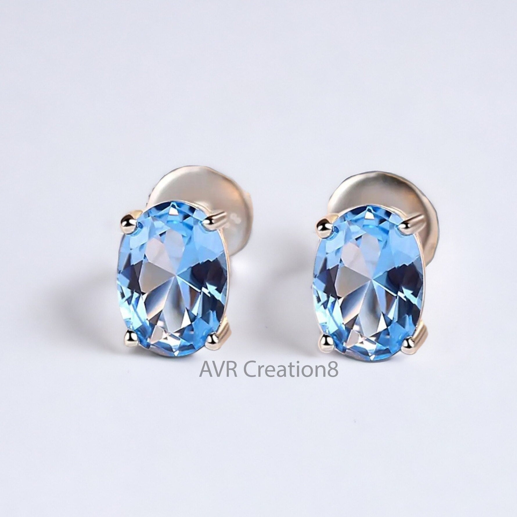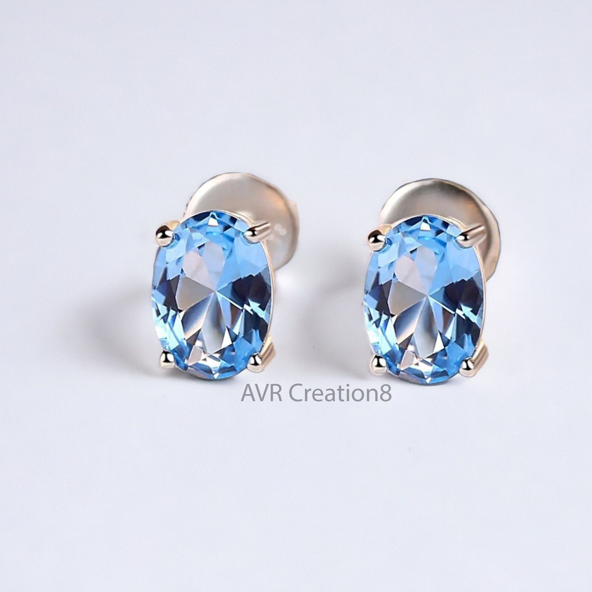 Blue Topaz Oval Cut Gemstone Stud Earrings For Her, Blue Birthstone Earring, Minimalist Earrings, 925 Sterling Silver, Gifts For Girlfriend