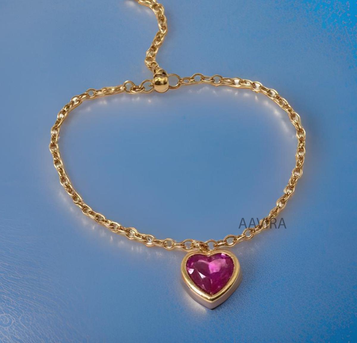 Dainty Heart Ruby Bracelet, Heart Ruby Silver Bracelet, Bezel Set Heart Bracelet, Minimalist Perfect Gift for Women, Unique Birthday Gift