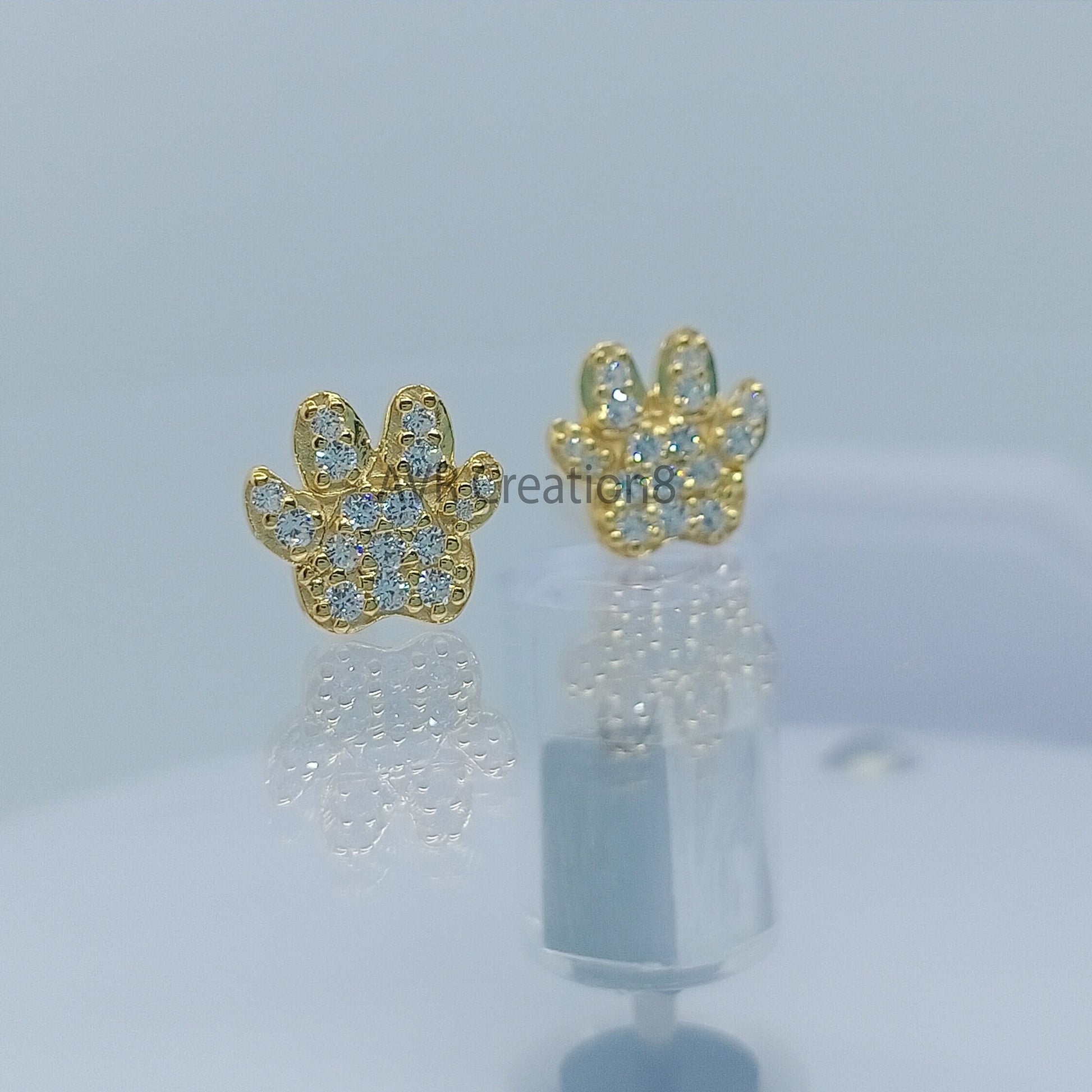Show your love for your furry friends with these adorable and dainty paw print stud earrings! Crafted in a charming gold tone (specify if it's solid gold or gold-plated sterling silver), each earring features a cute paw design fully encrusted with sparkling cubic zirconia (or tiny diamonds, if applicable). The brilliant pave-set stones catch the light beautifully, adding a touch of playful glam to your everyday look.