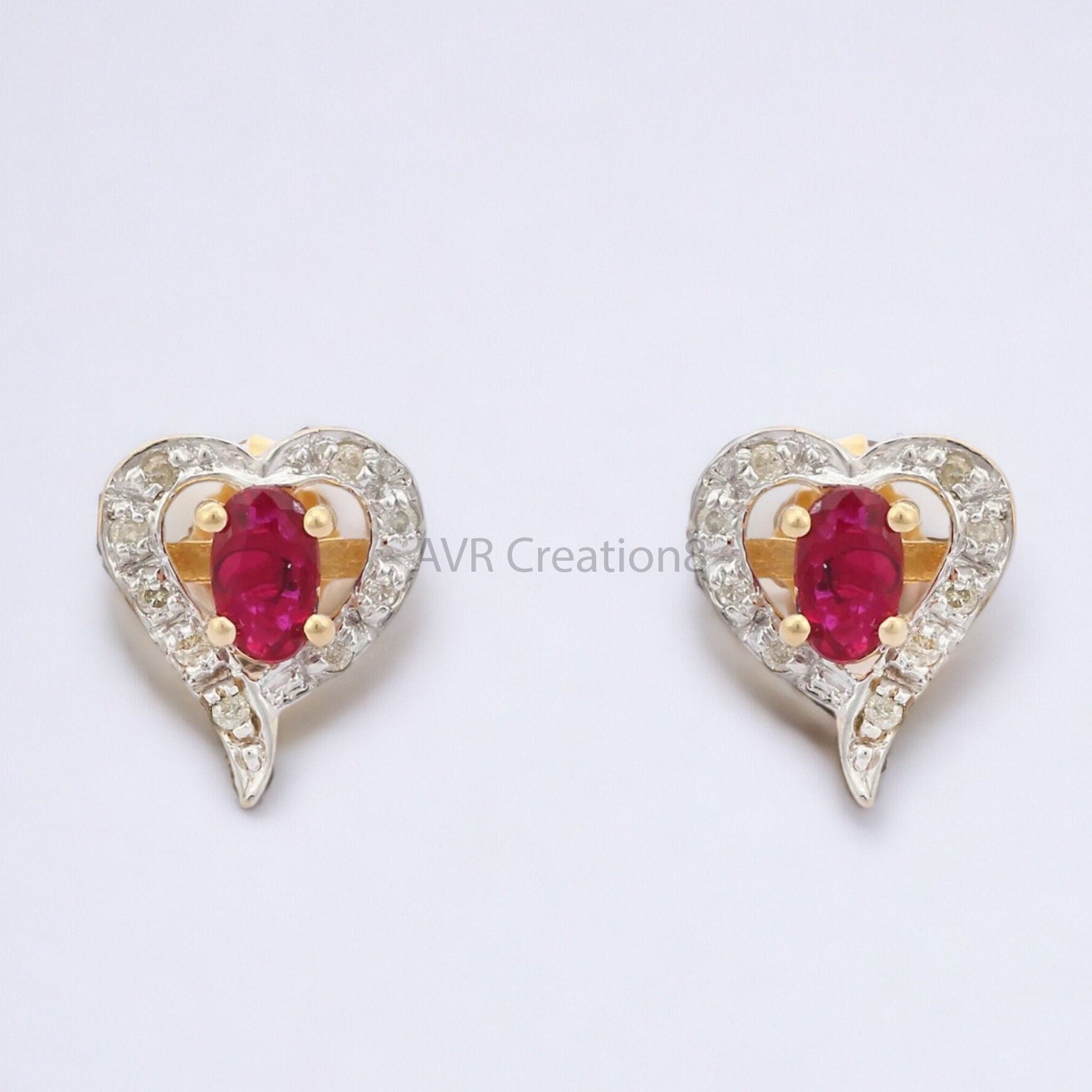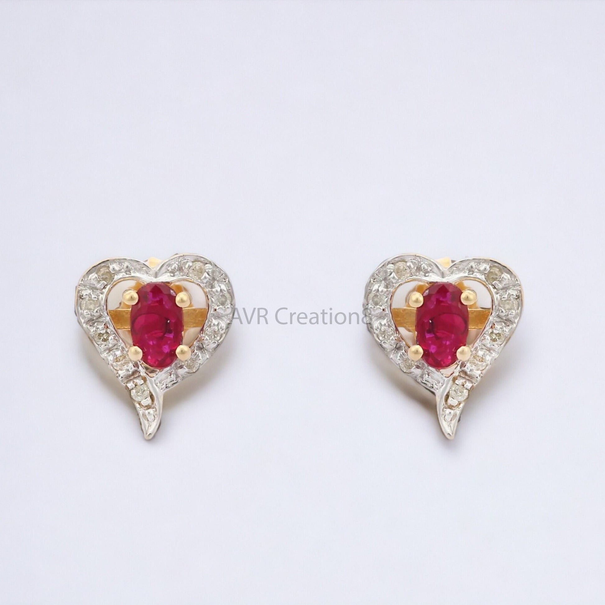 Heart Shape Oval Cut Red Ruby & Diamond Stud Earrings For Women, Minimalist Earrings, 14K Yellow Gold Plated, Mothers Day Gifts Earrings