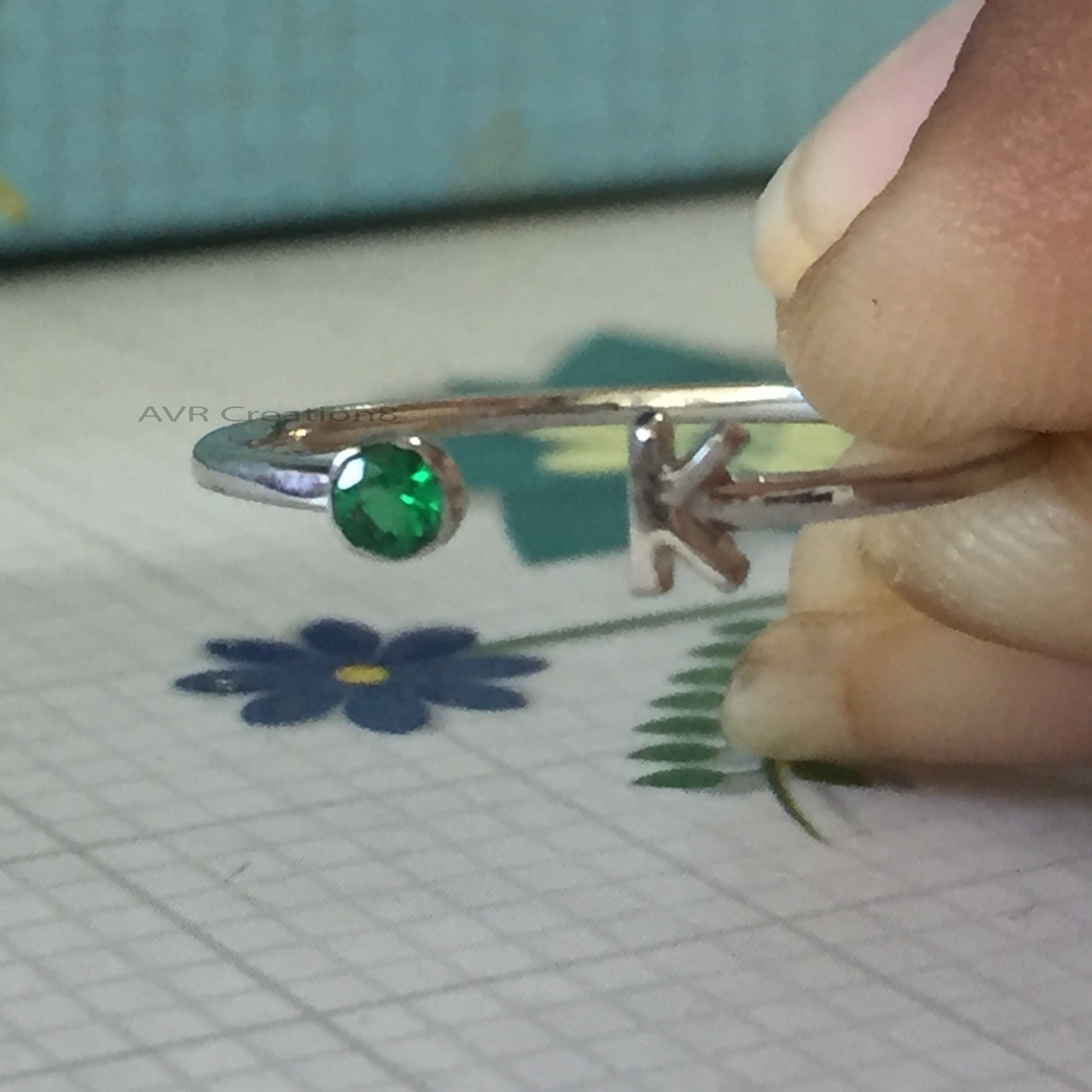 Open Design Emerald and "K" Initial Letter Ring, Dainty Open Cuff Ring, Handmade Ring, Round Emerald Ring, 14k White Gold Plated Size 7, Mother's Day Gifts, Silver Ring For Women's