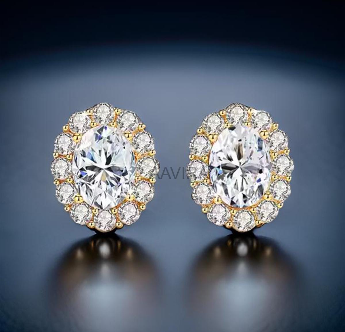 Oval Stud Earrings, Halo Oval Diamond Stud Earrings, 14K Yellow Gold Plated, Diamond Earrings, Push Back Earring, Wedding Earrings for Women
