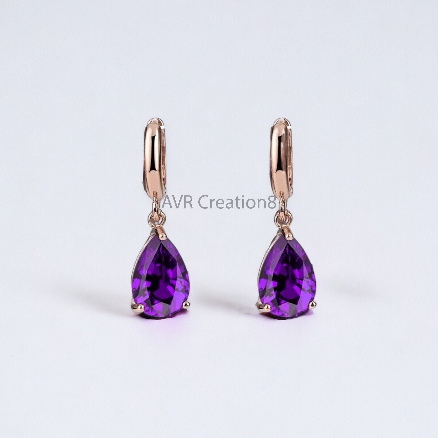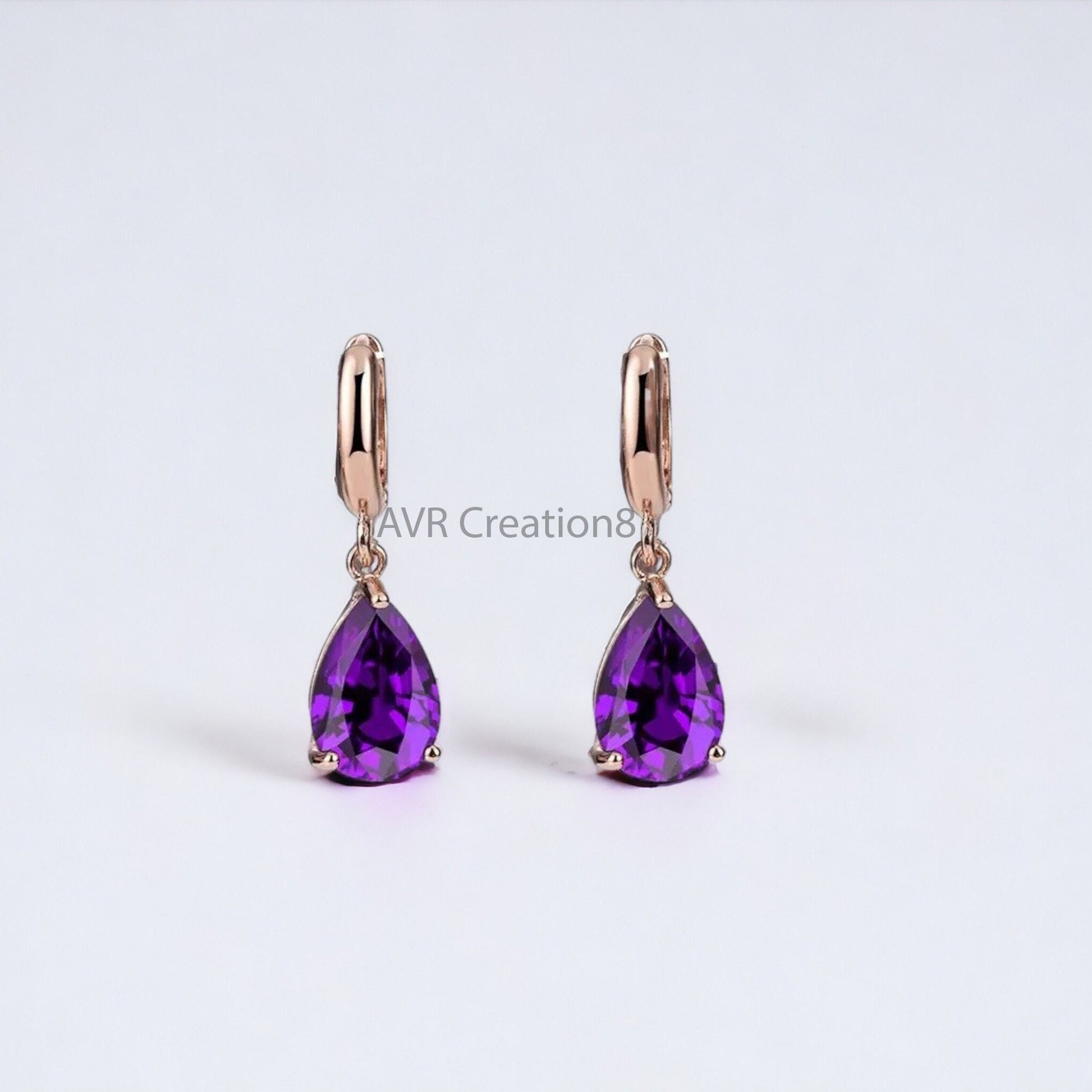 Purple Amethyst Pear Cut Drop Dangle Earrings For Her, 14K Rose Gold Plated Earrings, Purple Gemstone Earrings, Handmade Solitaire Earrings
