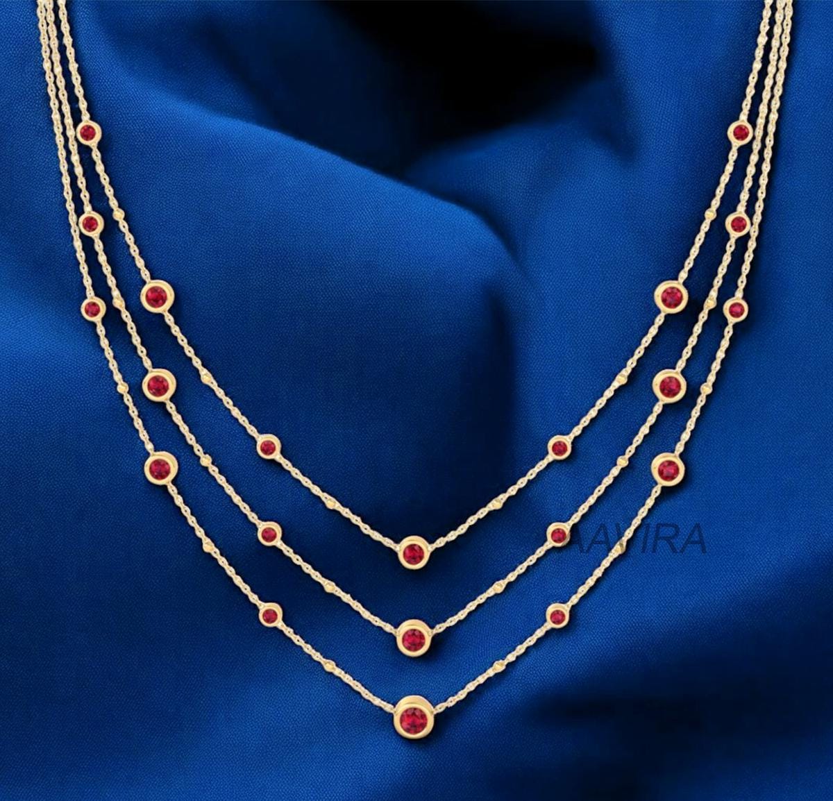 Three Layering Necklace, Green Emerald Bezel Set Necklace, Anniversary Gift, Gemstone Necklace, Women's Pendant Necklace, Ruby Necklace Gift