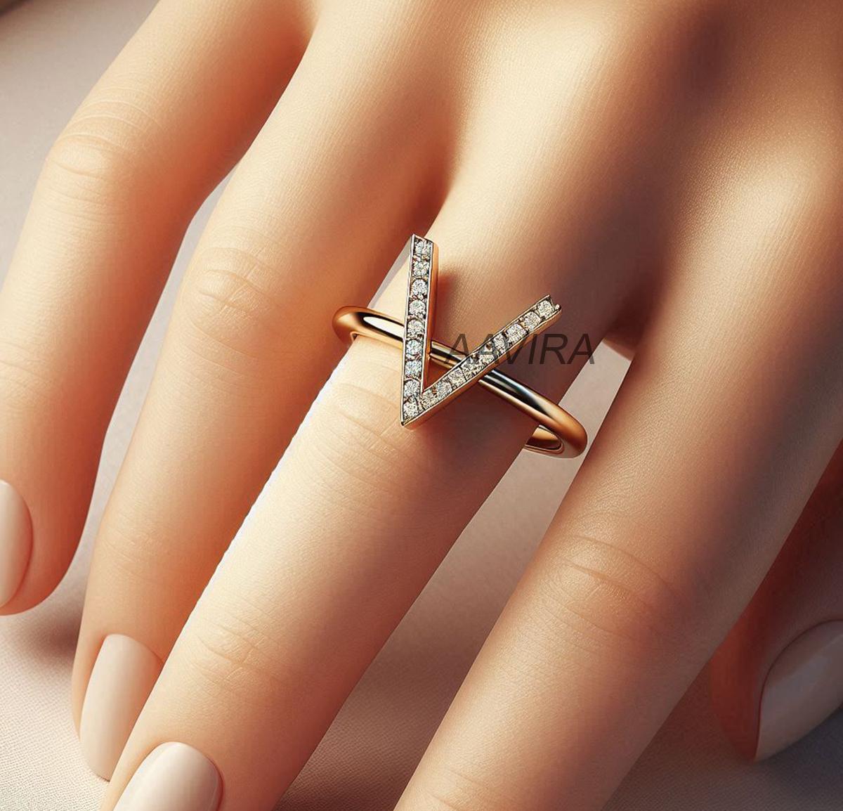V Moissanite Ring, Dainty Ring, V Pave Set Diamond Ring, V Diamond Ring, 14k Yellow Gold Plated, Handmade Ring, Gift for Mom, Handmade Ring, Gift for Her, Dainty Band, Perfect Gift for Friend, Gifts, Minimalist Diamond Ring, F Initial Letter K Ring, Pave Set Diamond Band, Christmas Gift, Mother's Day Gift